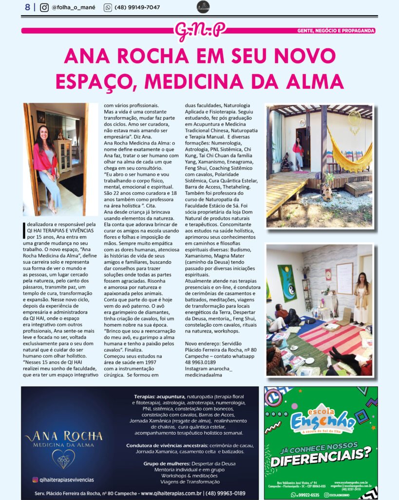 Idealizadora e responsável pela QI HAI TERAPIAS E VIVÊNCIAS por 15 anos, Ana entra em uma grande mudança no seu trabalho. O novo espaço, “Ana Rocha Medicina da Alma”, define sua carreira solo e representa sua forma de ver o mundo e as pessoas, um lugar cercado pela natureza, pelo canto dos pássaros, transmite paz, um templo de cura, transformação e expansão. Nesse novo ciclo, depois da experiência de empresária e administradora da QI HAI, onde o espaço era integrativo com outros profissionais, Ana sente-se mais leve e focada no ser, voltada exclusivamente para o seu dom natural que é cuidar do ser humano com olhar holístico.