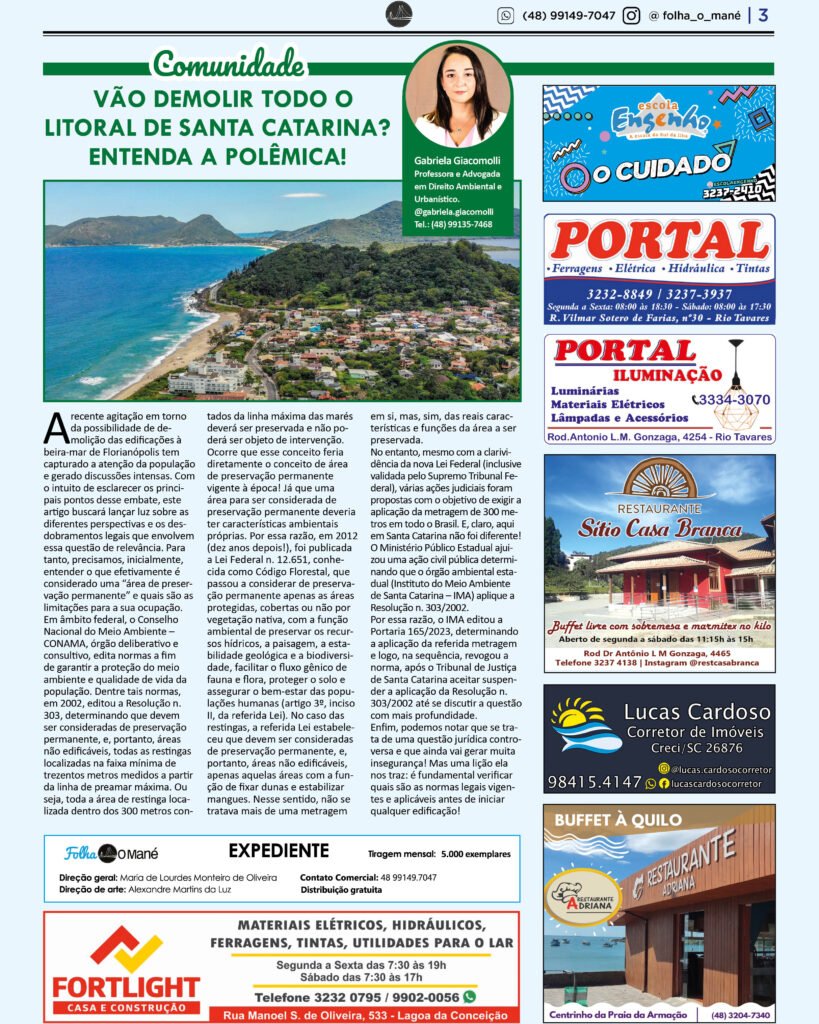 A recente agitação em torno da possibilidade de demolição das edificações à beira-mar de Florianópolis tem capturado a atenção da população e gerado discussões intensas. Com o intuito de esclarecer os principais pontos desse embate, este artigo buscará lançar luz sobre as diferentes perspectivas e os desdobramentos legais que envolvem essa questão de relevância. Para tanto, precisamos, inicialmente, entender o que efetivamente é considerado uma “área de preservação permanente” e quais são as limitações para a sua ocupação.